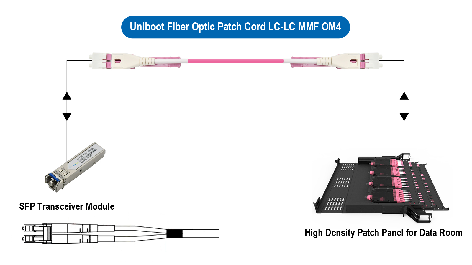 The uniboot fiber optic patch cable design improves the effectiveness and flexibility of cable management while saving a lot of space. It is an ideal solution for high-density routing.Cable assemblies with LC duplex uni-boot fiber optic connectors save half of the optical cable infrastructure space over traditional duplex cable products.