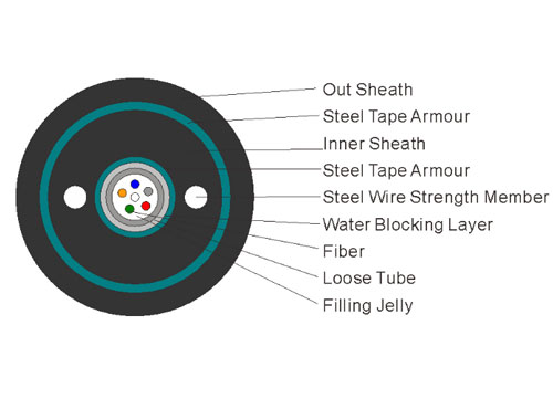 GYXTW53 is Double Armored and Double Sheathed central tube optical cable with a loose tube in the center of the cable, and two reinforcing members are located beside the loose tube. The number of GYXTW53 optical fiber cable cores is small, usually less than 12 cores,currently can reach 24 cores.