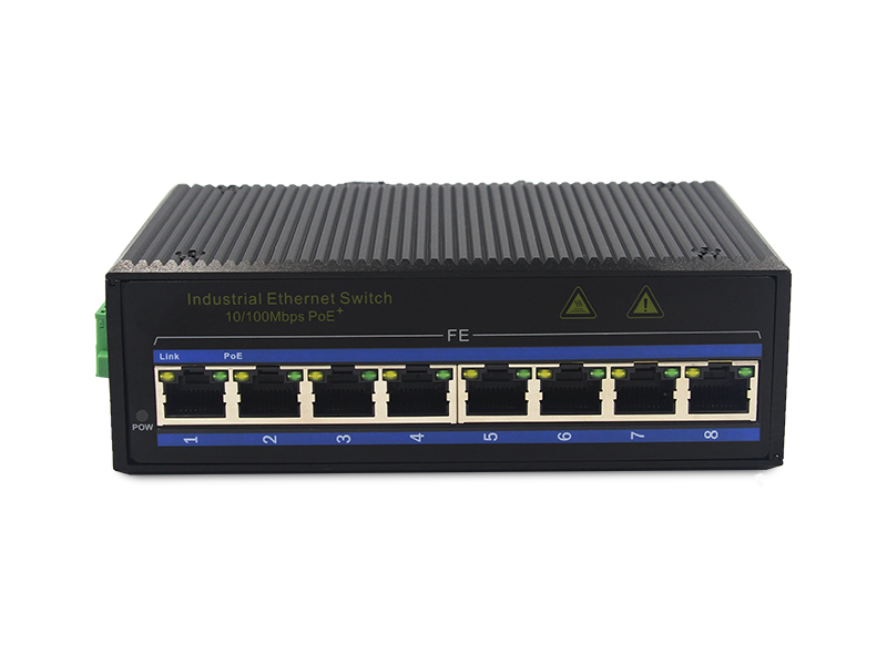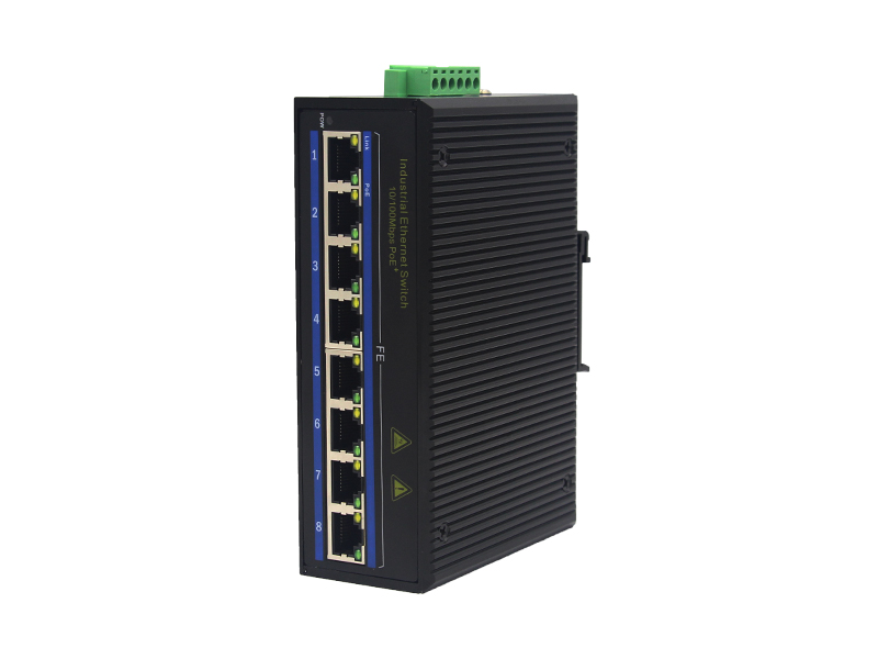 The 8-port 100M industrial Ethernet switch provides 8 RJ45 electrical ports, and the power supply supports overload protection and anti-reverse protection. It meets the requirements of industrial four-level electromagnetic compatibility and has no fan for efficient heat dissipation and reduces repair time.
